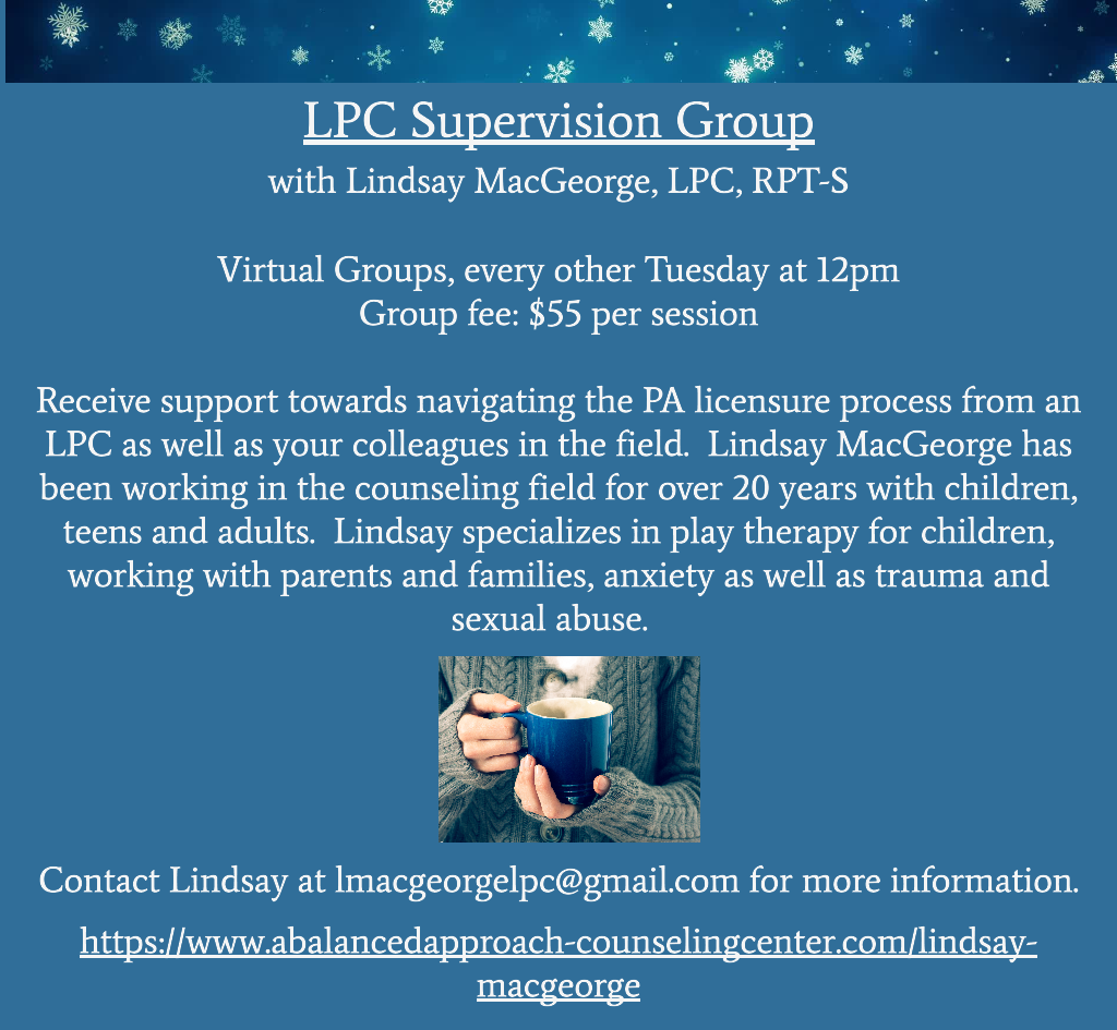 As a Licensed Professional Counselor in Pennsylvania, Lindsay provides supervision for individuals seeking licensure as an LPC.